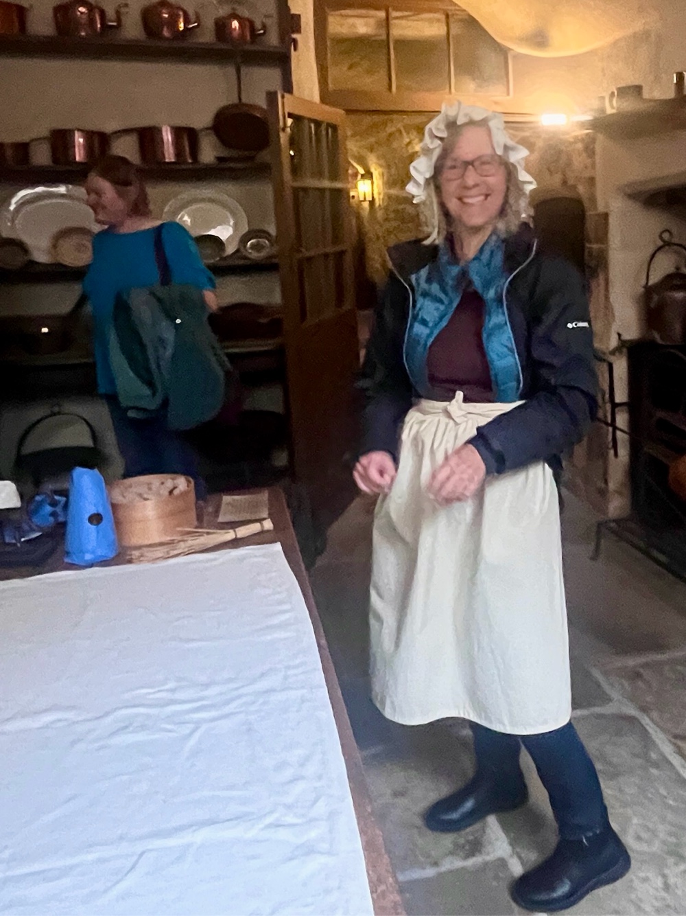 We then toured a museum at One Crescent, which also kept us out of the weather, and that was a fun little dip back in time. Most was “do not touch” but once down in the kitchen galley there were aprons you were allowed to touch. Chris had fun pretending to be Daisy from Downton Abbey.