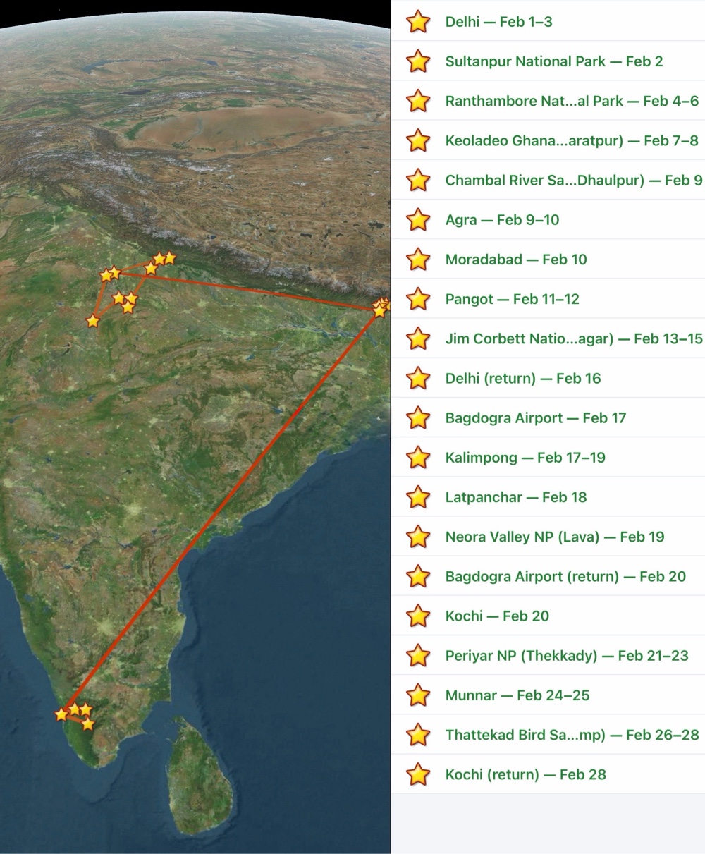 We’ve always wanted to go birding in India, but it’s a large country and somewhat intimidating. Fortunately, after much searching we found a good company for a private tour. We’re spending 20 days in northern India from west to east, and then seven days in southern India. Of course, India is a long way away, and Japan is halfway there. So we’re going to spend a few days in Japan first. Maldives is right around the corner so we might as well go back to Kudadoo. Our daughter is just outside of London, so that seems like a perfect place to stop on the way back.