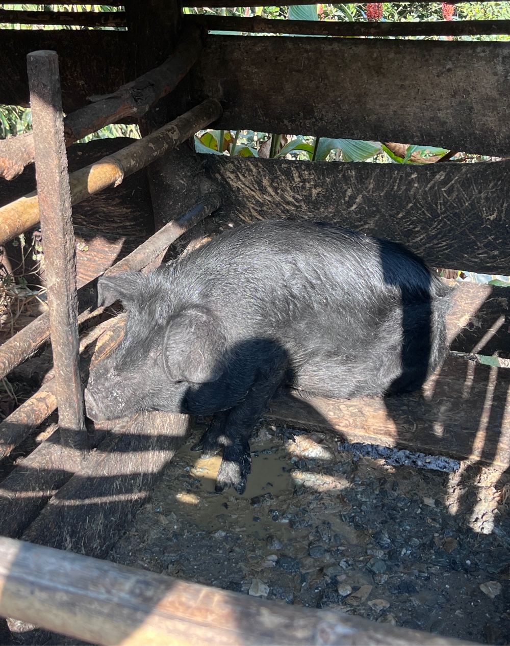 The hide was really just a water drip to attract birds with a structure about 15 feet away to hide the birders. .It wasn’t very birdy but we saw and got good photographs of about 10 species. Mrs. Gould‘s sunbird is attracted by bottle brush plants conveniently located next to a pigsty.