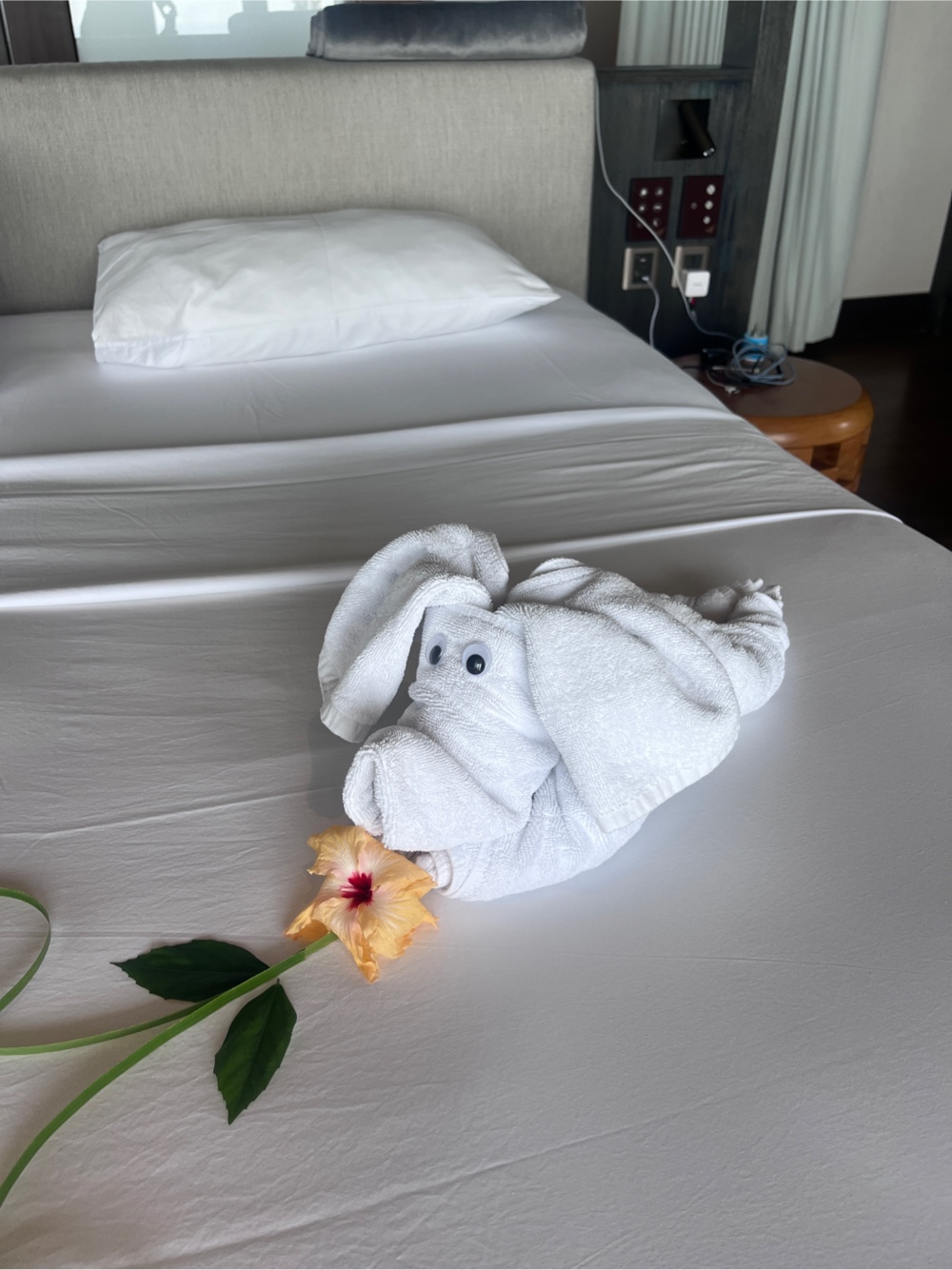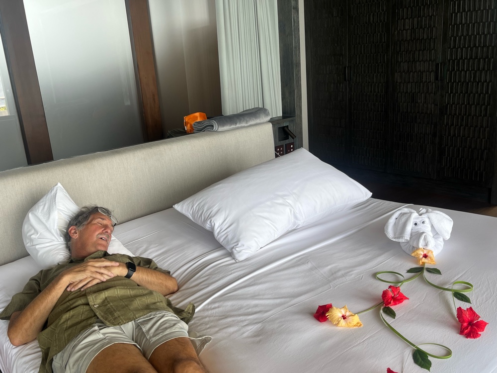 Well, another perfect breakfast brought to the villa early at 7:15 (once an early bird always an early bird) followed by Mike going scuba diving and Chris doing a yoga session. We then had a nice meal over at the main retreat and when we got back we were greeted by a lovely surprise left by Ali. It must be difficult for the housekeeper to figure out when to draw the special bath with our crazy no dinner and early to bed routine and we appreciate the effort to squeeze it in today. We had a beautiful cheese course followed by wagyu for Mike and fish for Chris and we finished up a nice wine we selected yesterday and had them decant half each day. We have so much more self control than our old selves did! We still have our dream island escape activity coming up followed by our last massages at 6 pm. Someone needed a short cat nap to keep up with this activity level😉. Or should it be a puppy nap? This is too adorable the towel art!